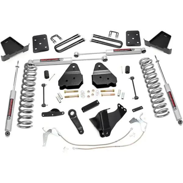 This suspension features luxury ride coil springs matching OE coils rates that are specifically designed for diesel motors. A heavy duty track bar relocation bracket properly centers the axle and matches the steering angles created by the supplied drop pitman arm while the radius arm drop brackets maintain the Super Duty's O.E. caster angles. A steering stabilizer relocation bracket maintains proper steering control but a RC problem solver single unit is recommended with larger tires and a RC dual stabilizer is required when running 37in tires.