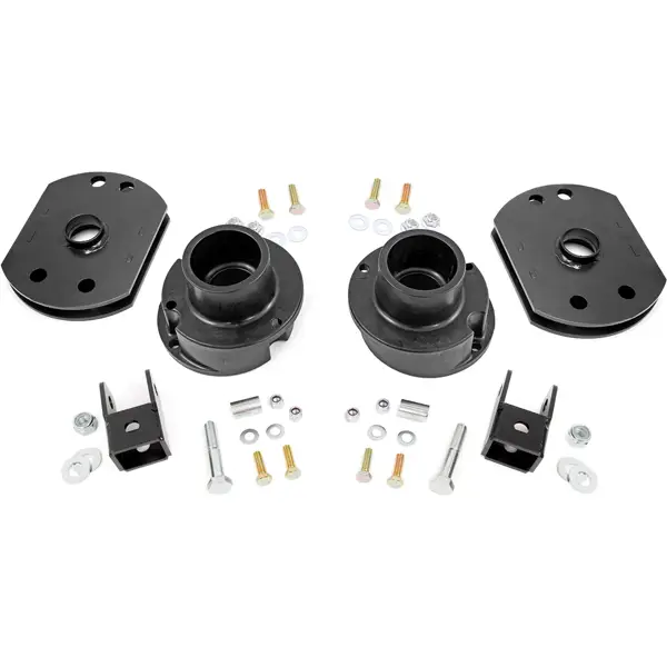 Rough Country's durable coil spring spacers have been expertly redesigned to match the factory geometry of your truck, including the angle of the coil mounts and position of the rubber isolator, which perfectly indexes both springs to eliminate any chance of coil bowing. This kit has also been upgraded to include shock extension brackets that allow you to reuse your factory shocks at the optimum angle for your new lifted truck.