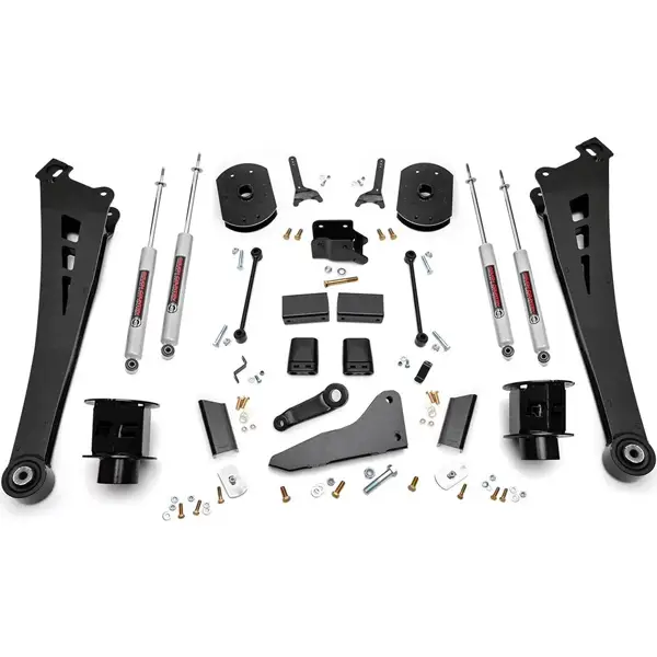 When changing a vehicle's suspension, the key to preserving ride quality is in keeping the geometry of all suspension components as close to their factory angles as possible. Rough Country's new 5-inch Suspension kit features a set of ultra-durable Radius Arms, precision fit to bolt right into the factory mounts for an easier install and a more factory-like angle. These beefy, upgraded Radius Arms also feature a durable, durable rubber bushings for maximum vibration absorption. In a further effort to preserve the truck's factory ride, this kit retains the factory progressive rate coil spring -- designed by Dodge specifically for the weight and ride quality of these new model trucks.