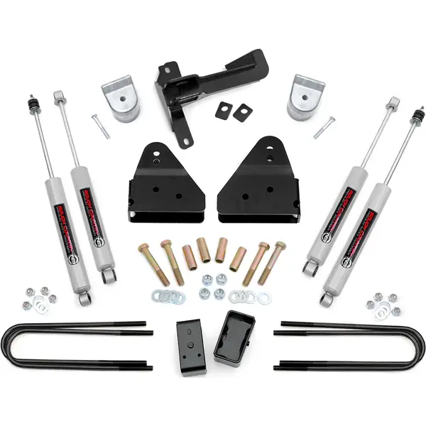 A set of Rough Country's premium N3 shocks are also included. These fine tuned 10-stage variable high-pressure Nitrogen charged shocks offer a fantastic blend of off-road action and smooth highway ride quality. With a durable 18mm spring-loaded piston rod and faster-cooling 54mm shock body.