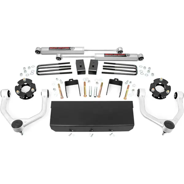 Rough Country's 3in Bolt-On Kit offers easy installation and aggressive good looks at an incredible value. Take your truck to new heights with this excellent option for Nissan Titan XD pickups.This kit features a set of high-quality, Forged Aluminum Upper Control Arms designed to make alignment adjustments easier and durable rubber bushings. These arms are designed to promote a factory-like geometry by keeping the ball joint at optimum angles after lifting. This design allows for an improved, greater range of motion from the ball-joint, with less stress, wear and tear.Also included are a set of durable strut spacers and fabricated rear blocks to provide lift height from front to rear. Once installed, this kit gives your truck plenty of ride height for up to 33in tires while offering a clean, level look from front to rear.This all-inclusive kit comes with everything you need, and installation is a piece of cake compared to other kits on the market! Featuring a primarily bolt-on installation process, this kit can be installed using common tools in a home garage, and allows the truck to be returned to stock at any time if so desired. Best of all this kit features Rough Country’s Lifetime Replacement Warranty.