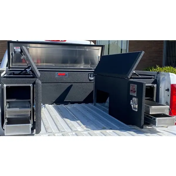 The Fuelbox Pork Chop Tool Box has a full latch and connection rod cover that prevents tools and storage from interfering with latching and opening of the top storage compartment. It has a single stainless steel latch and lock assembly on the front door & a push knob inside the toolbox to open the top lid.