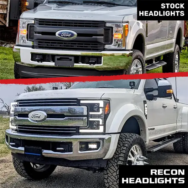 Upgrade the front of your 2017-2019 Ford Super Duty (F250, F350, F450, F550) with Recon Ultra High Power Projector Headlights. Designed as direct replacements for factory halogen headlights, these lights feature ultra high-power smooth white OLED daytime running lights and scanning amber LED turn signals, providing a modern and sleek look. These Recon LED headlights offer significantly improved visibility. Available with smoked or clear lenses, installation is a straightforward plug-and-play process.