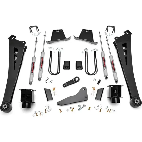 When changing a vehicle's suspension, the key to preserving ride quality is in keeping the geometry of all suspension components as close to their factory angles as possible. Rough Country's new 5-inch Suspension kit features a set of ultra-durable Radius Arms, precision fit to bolt right into the factory mounts for an easier install and a more factory-like angle. These beefy, upgraded Radius Arms also feature a durable, durable rubber bushings for maximum vibration absorption. In a further effort to preserve the truck's factory ride, this kit retains the factory progressive rate coil spring -- designed by Dodge specifically for the weight and ride quality of these new model trucks.