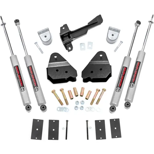 This kit features a set of front, lifted coil springs spacers allowing you to gain additional ride height without sacrificing ride quality or performance. A set of radius arm drop brackets as well as a track bar drop bracket is provided to keep everything at optimum angles for a factory-like ride, even after lifting. A set of Rough Country's premium V2 monotube shocks are also included. The V2 Monotube Shock Absorber is more than an upgrade - it’s a true performance shock. Each shock features a T6061 brushed aluminum body with black anodized accents giving it a striking visual appearance that also dissipates heat faster than other materials. The internal 46mm high-flow piston offers countless years of durability.