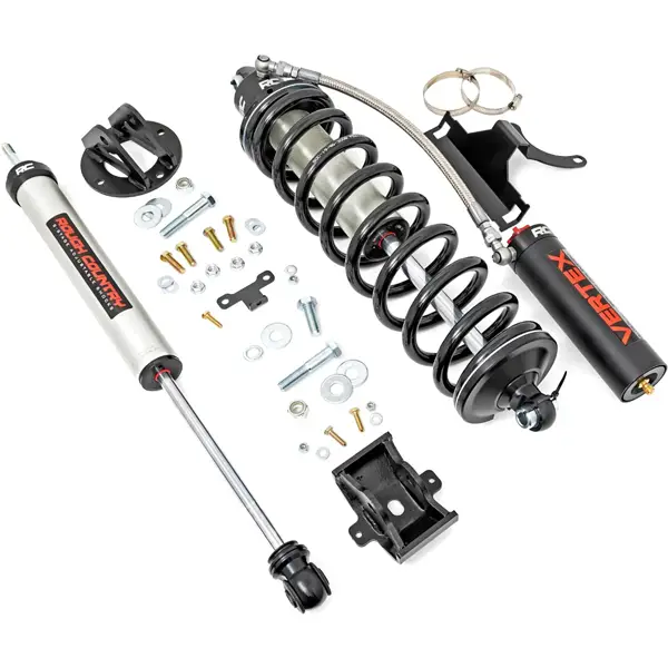 Rough Country’s 6" Coilover Conversion Kit features top-mounted reservoir brackets and coil-over mounts constructed from 1/4-inch steel. Utilizing this conversion kit you're removing the factory independent coil shock and coil set-up and replacing it with a massive 2.5in piston, nitrogen-charged, 8-stage adjustable Vertex Coilover. Rough Country’s Vertex Coilovers feature a monotube design with an external reservoir for increased oil capacity and damping sensitivity. When it comes to investing in a high-end kit, you’ll be pleased to find that Rough Country’s 2.5in piston design is beefier and offers an impressive 56% greater fluid capacity than the average reservoir shock. Each kit is paired with a monotube shock that provides optimal damping control.