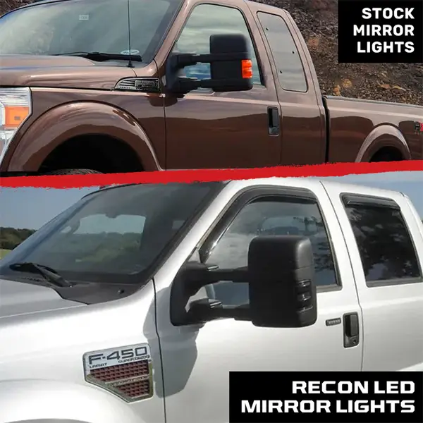 Upgrade the safety and style of your 2008-2016 Ford Super Duty with Recon LED Side Mirror Lenses featuring white and amber LEDs and smoke lenses. These ultra-bright LED side mirror lights offer a sleek smoked lens finish paired with vibrant white LED running lights and dynamic scanning amber LED turn signals, ensuring your truck stands out. Designed as direct replacements for factory amber mirror lenses, these Recon lights enhance visibility in all driving conditions, reducing the risk of accidents. Built with durable, military-grade ABS plastic and boasting an IP67 waterproof rating, these lenses are made to last. Installation is a simple plug-and-play process.