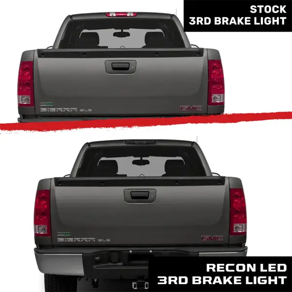 Designed for the 2007-13 GMC Sierra & Chevy Silverado 1500/2500/3500. This LED smoked third red brake light kit from RECON comes complete with white CREE XML LED cargo lights. It's the perfect GMC or Chevy truck upgrade. As one of our most popular third brake light upgrades we know this product is just what every GMC or Chevy truck owner needs, too. It's the best smoked third brake light there is. It's simple, yet powerful. That's why we made this smoked third brake light.